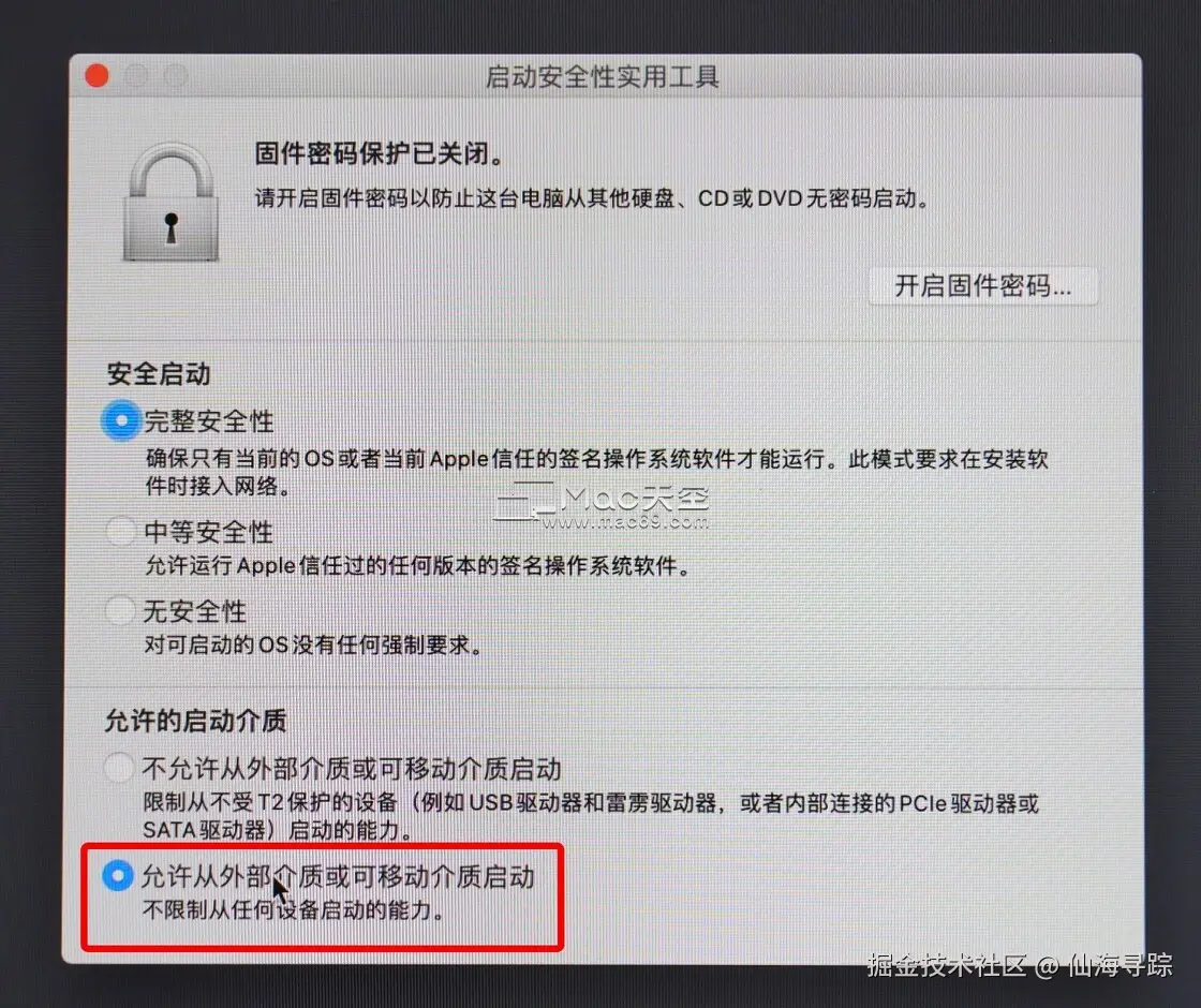 如果你的设备是配备T2安全芯片的下列设备,则需要先开启「允许从外部介质启动」,如果不是,这一步可以跳过: