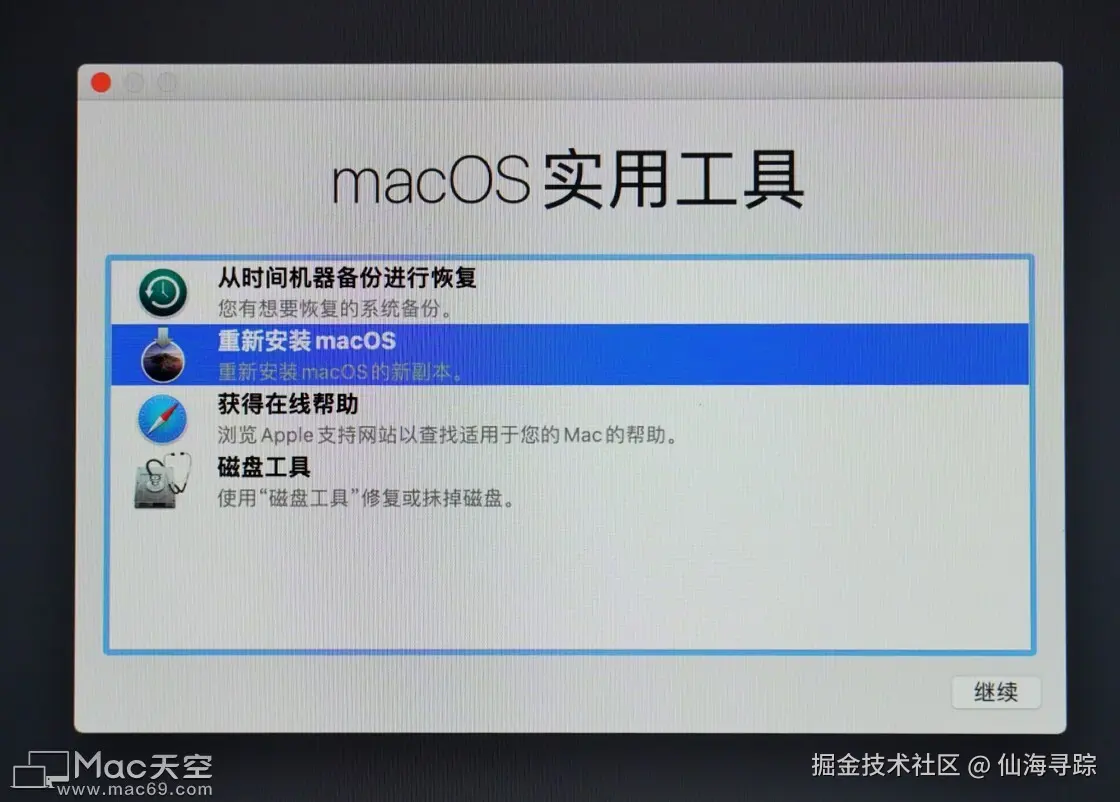 成功抹掉后,关闭「磁盘工具」窗口,回到「macOS 实用工具」。因为安装系统需要联网,检查一下网络是不是连上的。然后点选「重新安装macOS」。