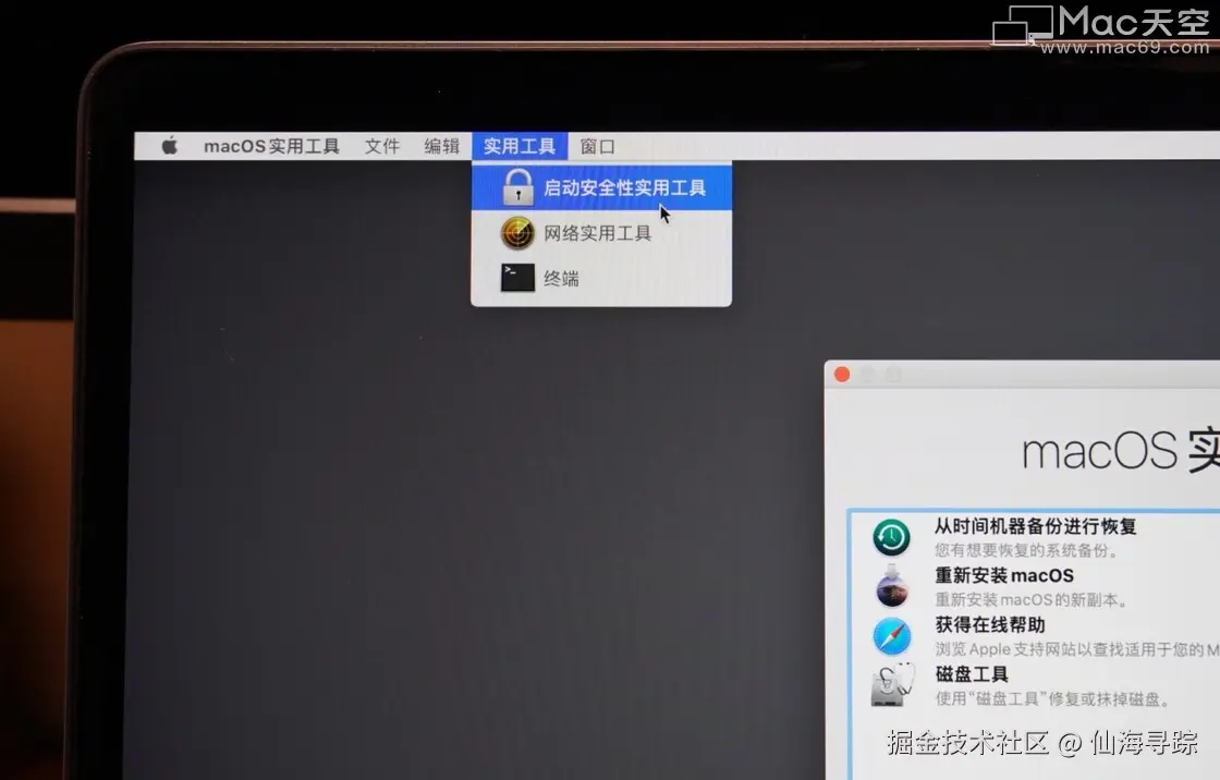 T2 安全芯片的 Mac 需要在顶部栏点击「实用工具」-选择「启动安全性实用工具」。然后把「允许的启动介质」勾选到「允许从外部介质或可移动介质启动」。设置完成时候关掉窗口,回到「macOS 实用工具」。