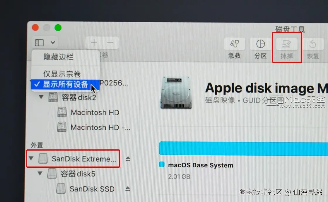 回到「macOS 实用工具」之后,选择「磁盘工具」并继续。进入「磁盘工具」之后,选择左上角的下拉菜单中的「显示所有设备」,然后左侧选中「外置」栏目中的的硬盘(不要选宗卷或分区)。确认选择无误之后,点击顶部工具栏的「抹掉」。