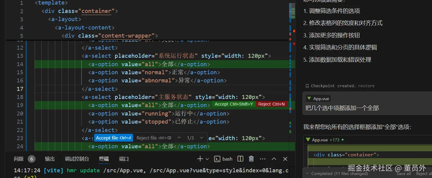Ctrl+I:这个快捷键能唤起composer,让自然语言编程成为现实。和普通聊天不同,composer会直接动手改代码,而且还会像Git那样,清晰地展示出删除和新增的代码,方便你审阅。满意就accept,不满意就reject