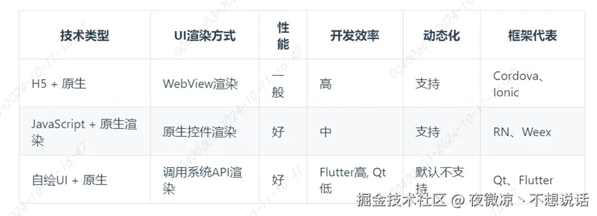 开发层语法不一样,底层编译的成果物类似,渲染时需要 JavaScript 和原生之间通信,有些场景如拖动可能会因为通信频繁导致卡顿,有js语言参与,解释执行速度慢; 渲染依赖原生控件,不同平台的控件需要单独维护,更新会滞后,维护成本高;