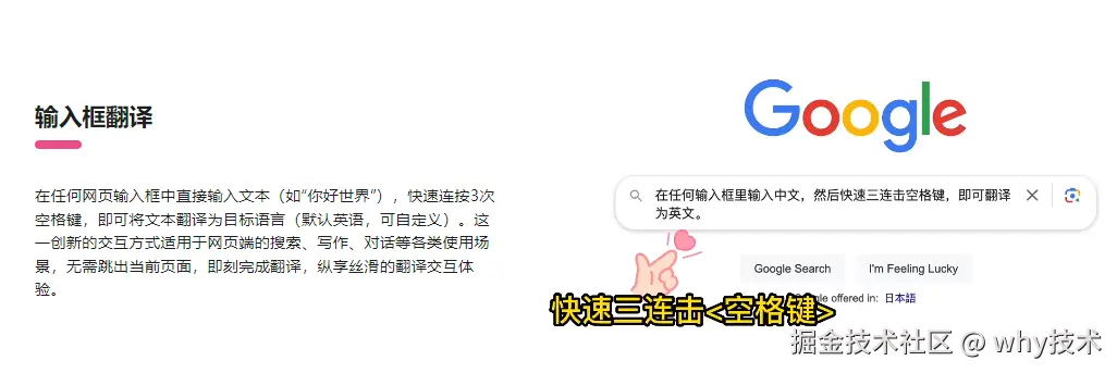 “沉浸式插件”支持你在输入中文之后,快速点击三次空格键,直接把中文翻译成英文。