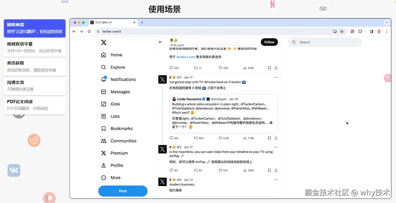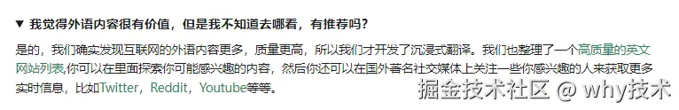 是真的“沉浸式”,它会通过智能识别网页主内容区域进行双语对照网页翻译,降低对原网页的“侵入性”,从而有更好的外文网页翻译和阅读体验。