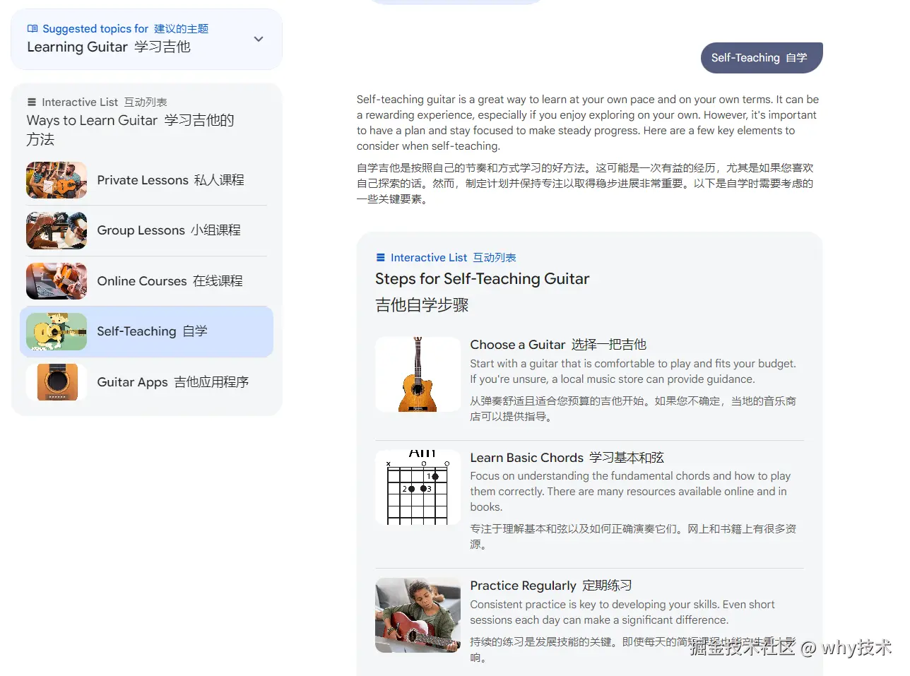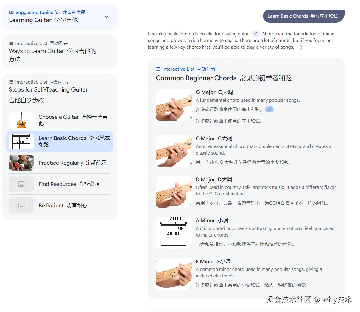 然后再次出现一个“互动列表”,从选吉他开始,到学习基本和弦,再到慢慢练习: