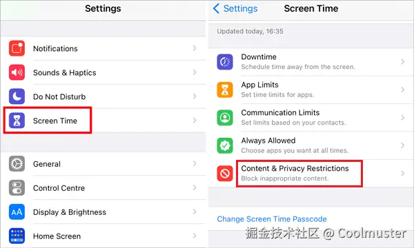 步骤 2. 向下滚动并点击“屏幕时间”,然后点击“内容和隐私限制”。如果出现提示,请输入您的 iPhone 密码。