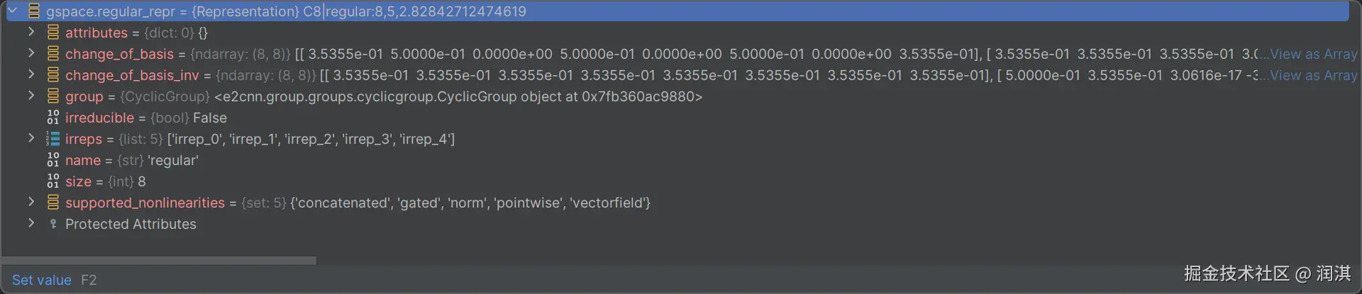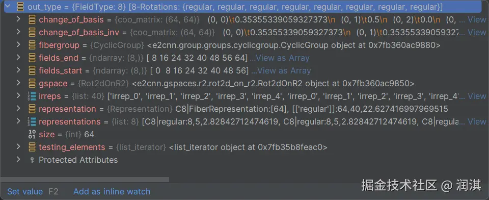 然后我们在进去对应FiledType之前,我们系要使用对应regular_repr函数,这里的话就是我们在创建群是创建的平凡表示(碎碎念:其实平凡表示我搞得也不是很懂,但是这个内容是群中的一个概念,这个系列对于一个没有学习过群论的人来说确实有点难度,这里的话还是先放在这里吧)。