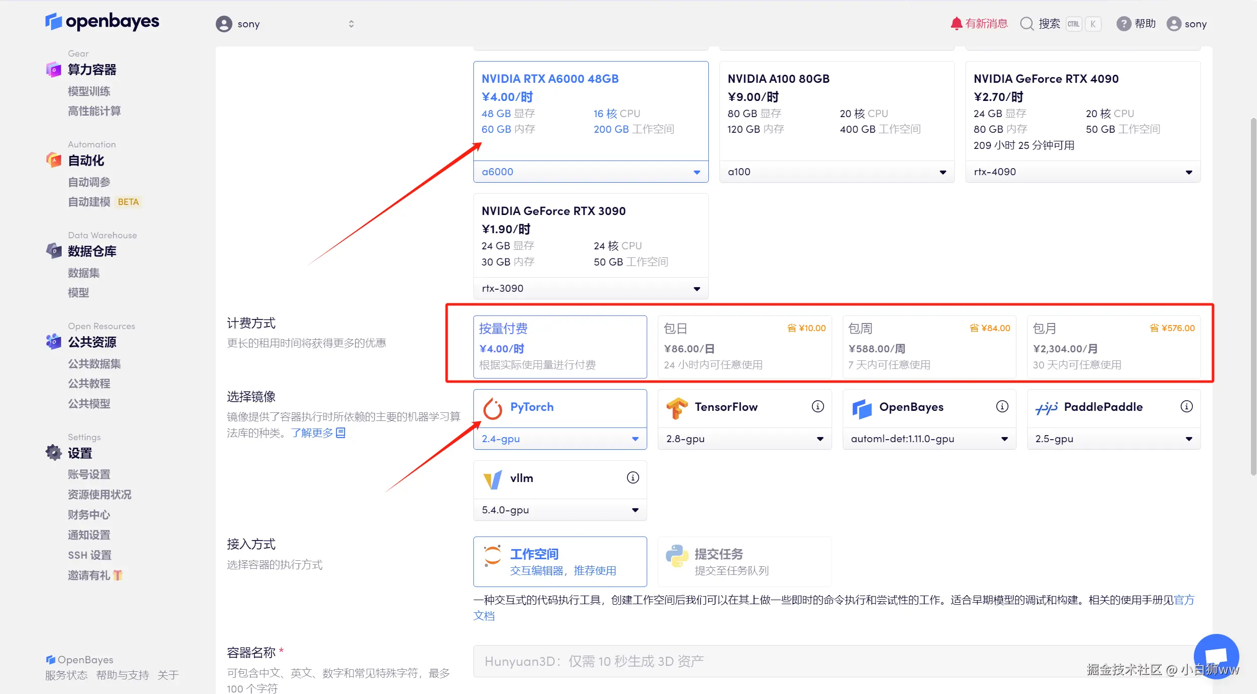 选择「NVIDIA RTX A6000」以及「PyTorch」镜像,OpenBayes 平台上线了新的计费方式,大家可以按照需求选择「按量付费」或「包日/周/月」,点击「继续执行」。