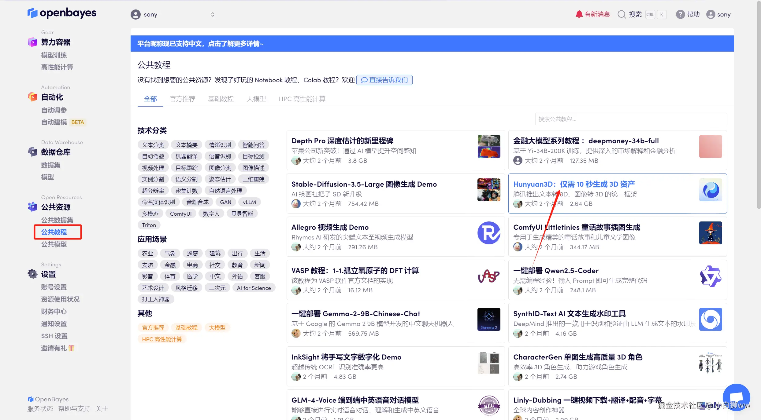 登录 OpenBayes.com,在「公共教程」页面,选择「Hunyuan3D:仅需 10 秒生成 3D 资产」教程。