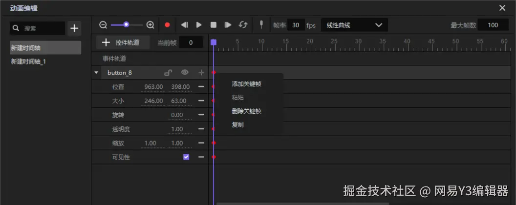 点击动画编辑,在弹出的窗口中点击加号添加动画组,并添加对应的控件轨道或事件轨道,即可开始制作帧动画。