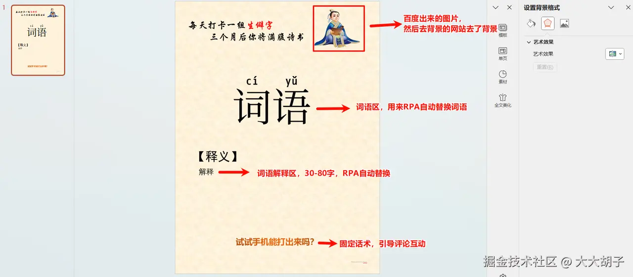要注意的是词语区和词语解释区,这2个区域的文本必须先默认是【词语】和【解释】,方便RPA脚本自动替换,其他的地方随便你自己怎么改都行。