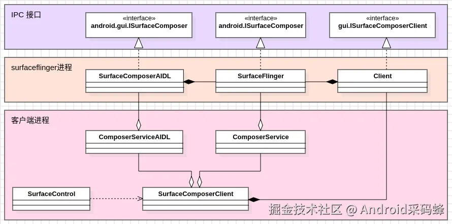 Client:实现了gui::ISurfaceComposerClient接口的IPC类,也可以和surfaceflinger进行跨进程交互,在SurfaceComposerClient对象初始化时,由