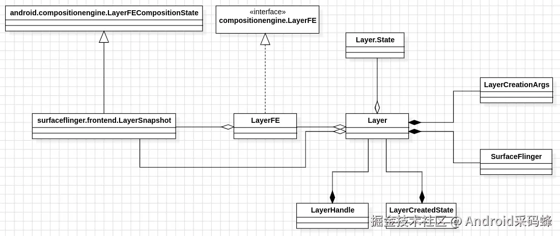 比如,Android U之前Layer对象即作为客户端设置数据的载体,给surfaceflinger中传递buffer,又参与到合成阶段,耦合严重,且不利于扩展。通过FrontEnd重构后,对这部分流程进行解耦,解除了Layer和LayerFE之间的继承关系: