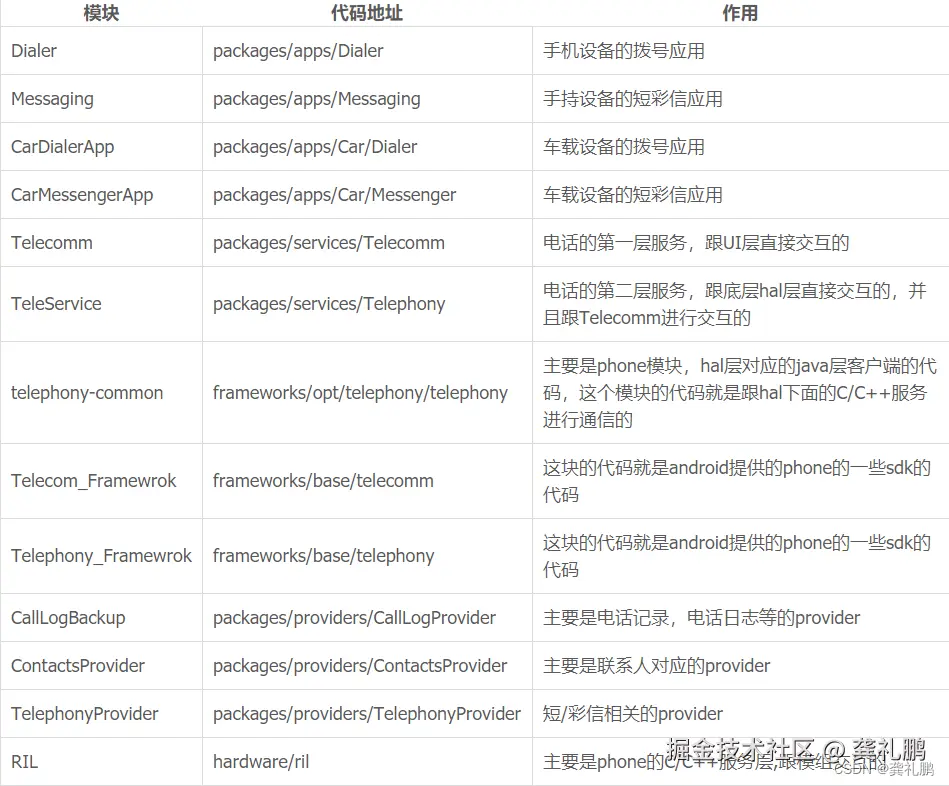 Telephony业务功能模块主要包括语音、短信、ICC 卡、网络服务以及数据连接等,这些功能模块是Android系统通话功能的核心和基础注:整个Framework层的Telephony框架运行在一个叫做Phone(com.android.phone)的进程中。而这个进程是在packages\services\Telephony模块中被创建的