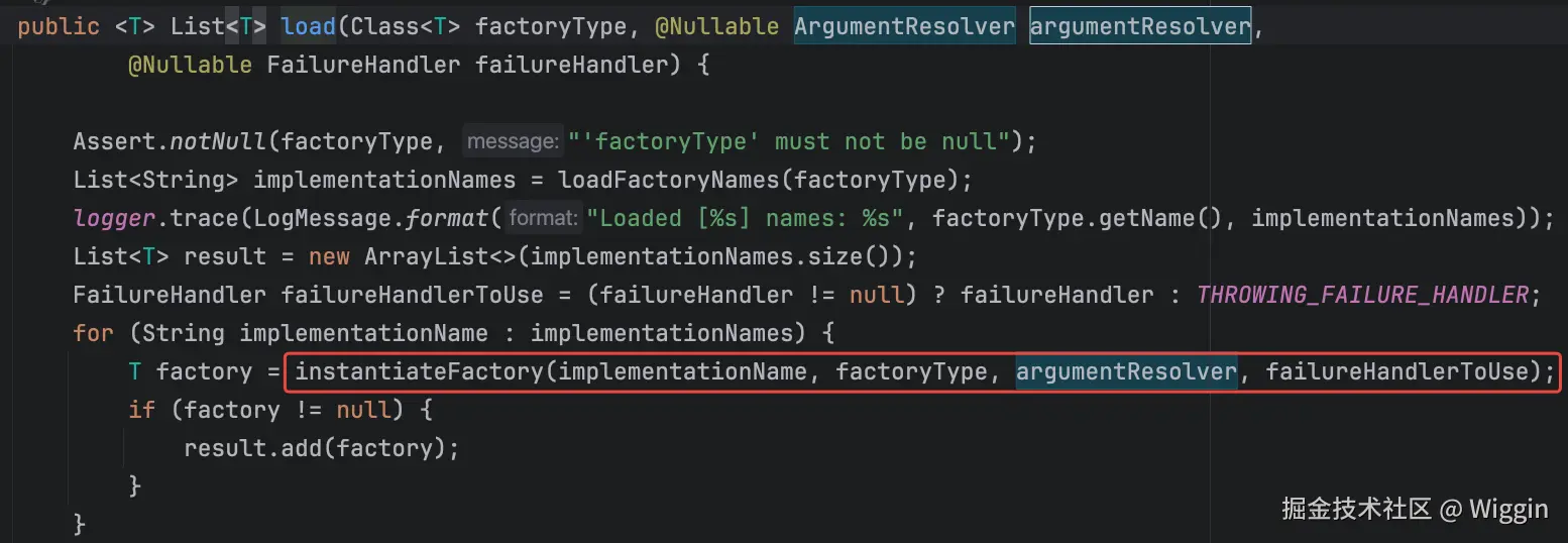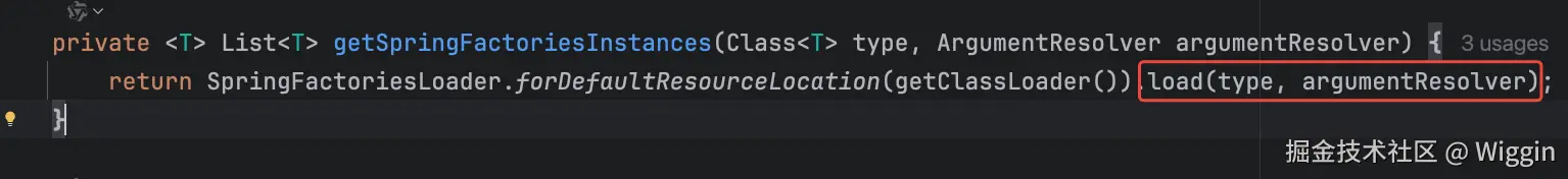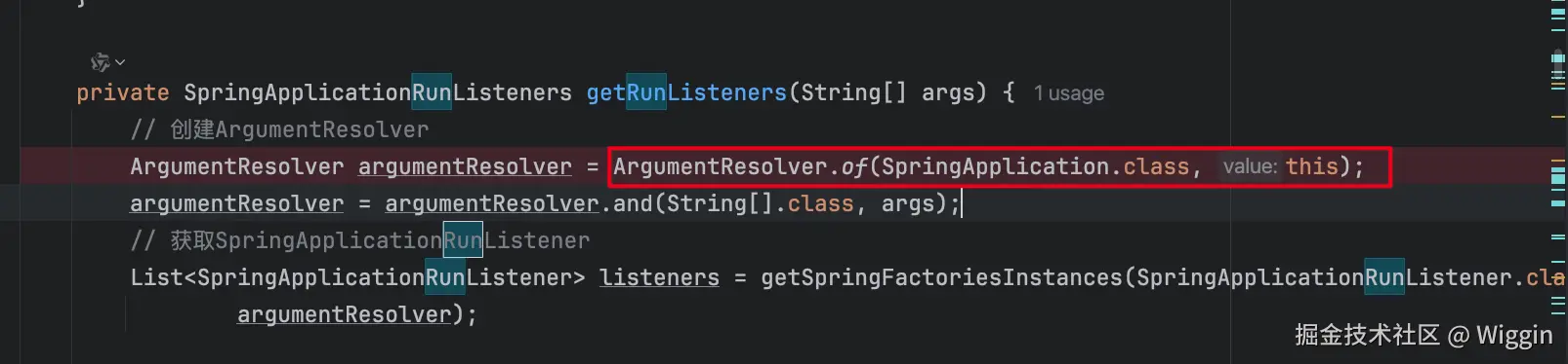 我们可以看到,具体使用到的地方是getSpringFactoriesInstances,这个我们熟悉啊,之前在了解SpringApplication初始化的过程中,我们有看过他的实现,但是那会argumentResolver默认是null。在获取SpringApplicationRunListener的时候,argumentResolver有做实际传入。我们可以看看当传入argumentResolver,getSpringFactoriesInstances会有哪些操作。