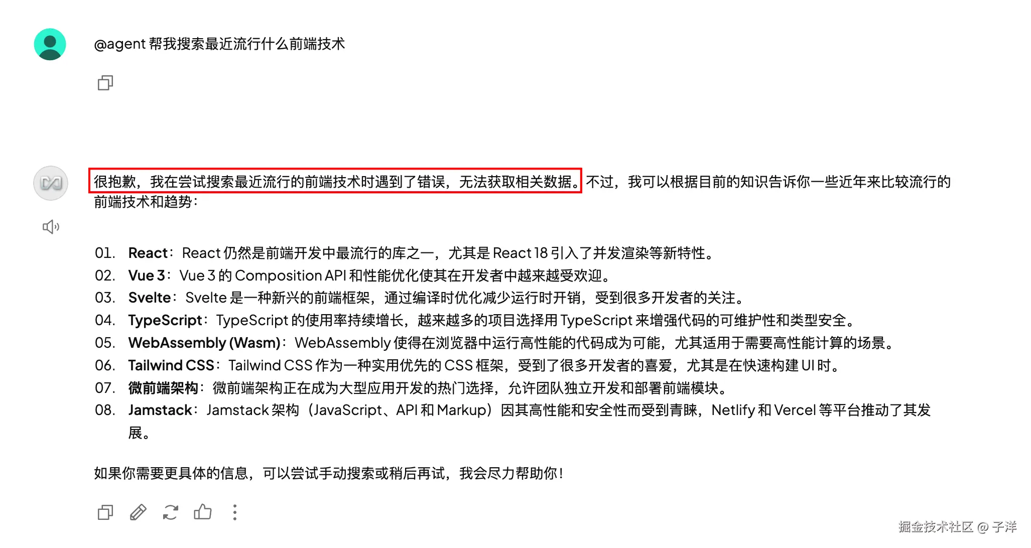 或者明确指示:“@agent 请帮我搜索一下最新的科技新闻。”