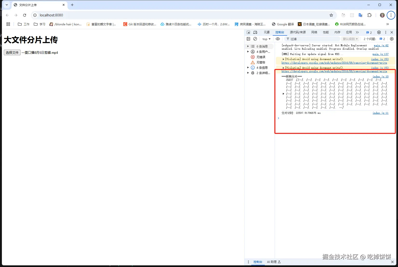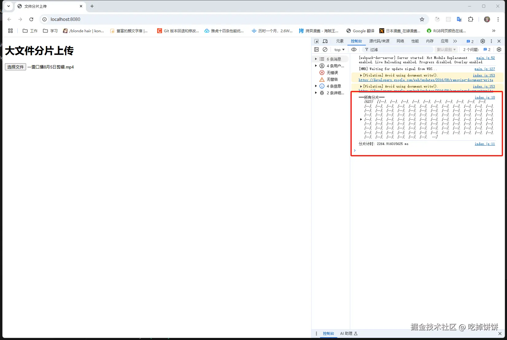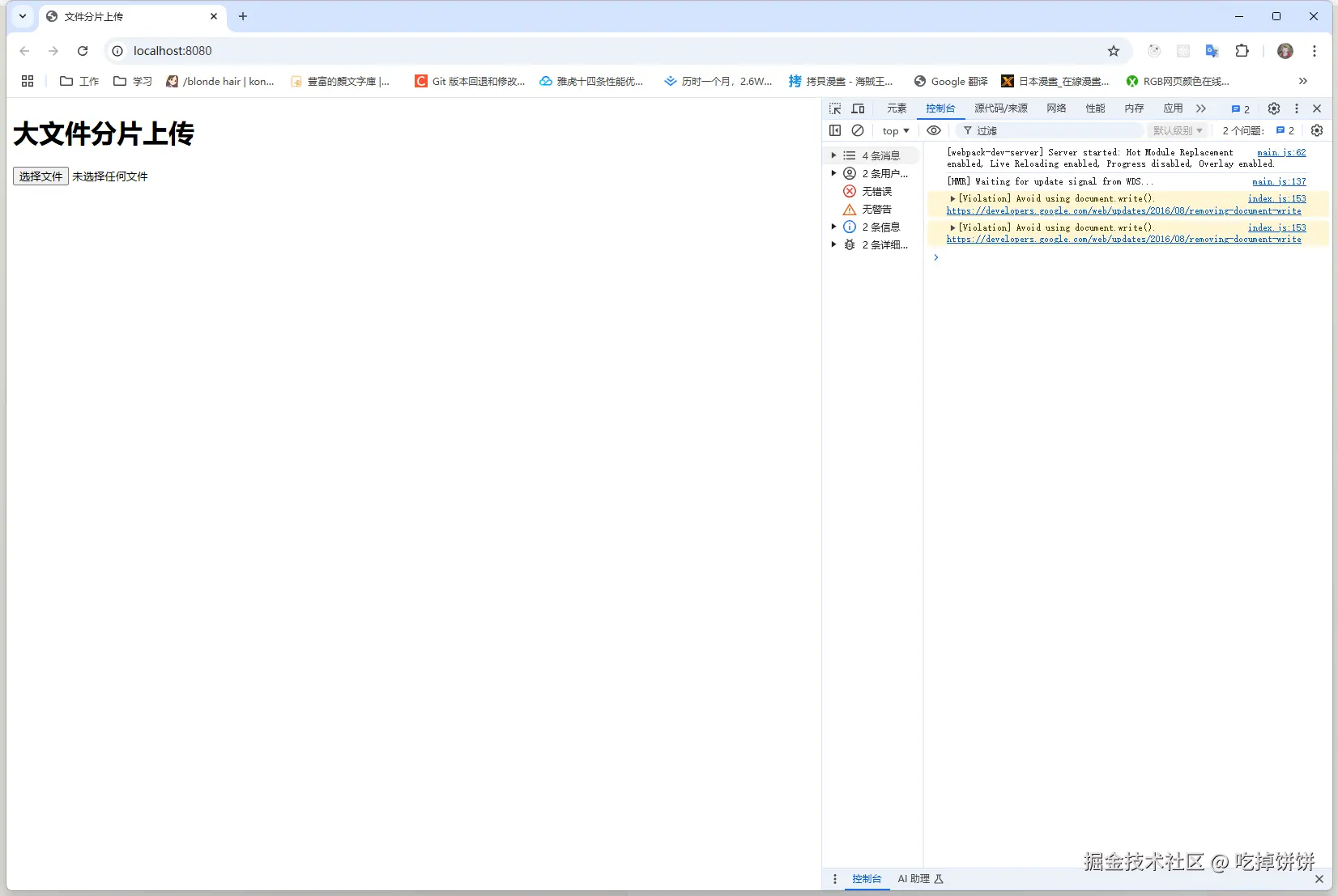 <!-- src/index.html --> <!DOCTYPE html> <html> <head> <meta charset="UTF-8"> <title>文件分片上传</title> </head> <body> <h1>大文件分片上传</h1> <input type="file" id="fileInput"> </body> </html>// src/index.js import { cutFile } from './cutFile'; document.getElementById('fileInput').onchange = async (e) => { console.time('分片计时'); const file = e.target.files[0]; const chunks = await cutFile(file); console.timeEnd('分片计时'); console.log('===所有分片===', chunks); };// src/cutFile.js import { createChunk } from './createChunk' // 假设和后端预定好了每个分片最大5M const CHUNK_SIZE = 5 * 1024 * 1024; export const cutFile = async (file) => { // 计算出分片的数量 const chunkCount = Math.ceil(file.size / CHUNK_SIZE) const result = [] for (let index = 0; index < chunkCount; index++) { const chunk = await createChunk(file, index, CHUNK_SIZE) result.push(chunk) } return result }// src/createChunk.js import SparkMD5 from 'spark-md5'; /** * 将文件分片的主函数 * @param {File} file - 用户选择的文件对象 * @returns {Promise<Array>} - 返回分片数组 */ export const createChunk = (file, index, chunkSize) => { return new Promise((resolve) => { const start = index * chunkSize const end = start + chunkSize // SparkMD5用于计算hash值 const spark = new SparkMD5.ArrayBuffer() const fileReader = new FileReader() // 每一片的blob对象 const blob = file.slice(start, end) fileReader.onload = (e) => { // 将分片内容添加到spark中 spark.append(e.target.result) // 返回这个分片的所有信息 resolve({ start, // 分片起始位置 end, // 分片结束位置 index, // 分片索引 hash: spark.end(), // 这一片的hash值 blob // 分片数据 }); } fileReader.readAsArrayBuffer(blob) }) } -