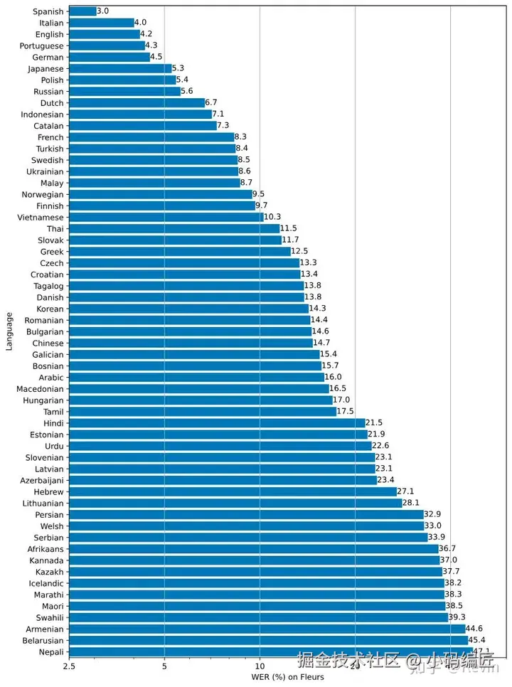 下图显示了使用该模型的 Fleurs 数据集按语言的 WER(单词错误率)细分large-v2(数字越小,性能越好)。