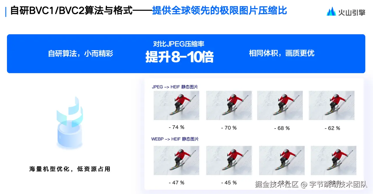卓特视觉目前拥有超过5.6亿的正版素材,并且数量仍在持续高速增长,占用的存储空间日益庞大,成本也与日俱增,veImageX提供存储服务,同时支持根据上传时间变更存储类型的智能降冷策略,有效节省存储的成本。此外, 为了进一步帮助企业降低存储成本,veImageX通过自研BVC算法,提供全球领先的极限图片压缩比,对比JPEG压缩率提升8-10倍,在不降低图片质量的前提下,在保持图片清晰度基本不变的情况下,单张图片体积节约超过70%,可以实现显著的成本节约。