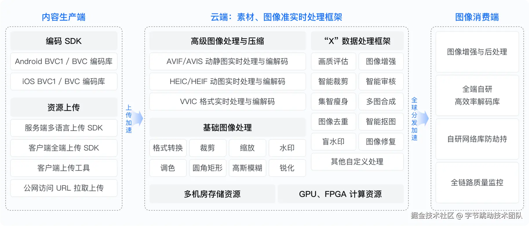 一套方案解决上传、存储、图像处理、分发、解码、QoS&QoE监控的全链路方案,覆盖从内容生产端到图像消费端。