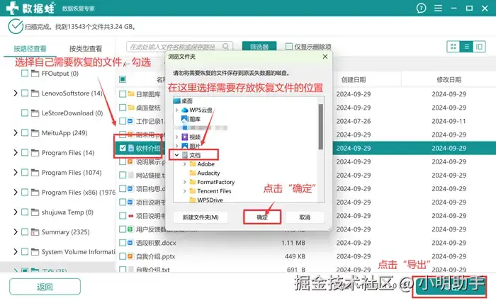 步骤2: 选择需要恢复的文件后,点击“导出”将文件恢复;最后再选择弹窗上显示的存储位置,选好恢复文件的存放位置后就能恢复数据了。