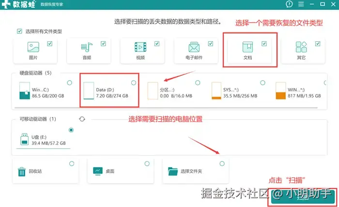 步骤1: 打开数据 蛙恢复专家,在首页选择目标数据类型和进行扫描的电脑位置,点击“扫描”;