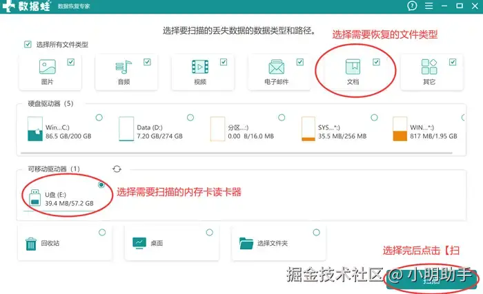 步骤1: 打开数据 蛙恢复专家,在软件简洁的首页上勾选好需要恢复的文件类型和扫描位置,最后点击【扫描】;