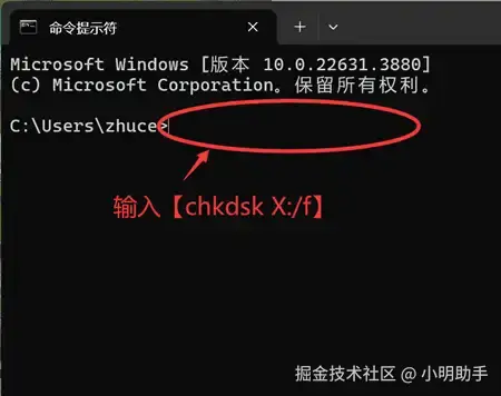 步骤2: 在电脑的菜单中打开【命令提示符】,在指定的位置上输入【chkdsk X:/f】,然后按下键盘回车键;