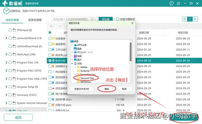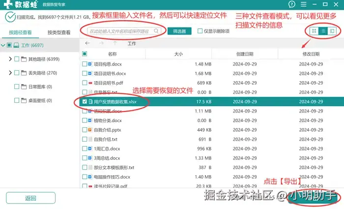 步骤2: 点击【扫描】后,软件开始进行指定位置的文件扫描,等待扫描结束后,用户可以选择自己需要恢复的文件,点击文件表示勾选,然后点击【导出】;
