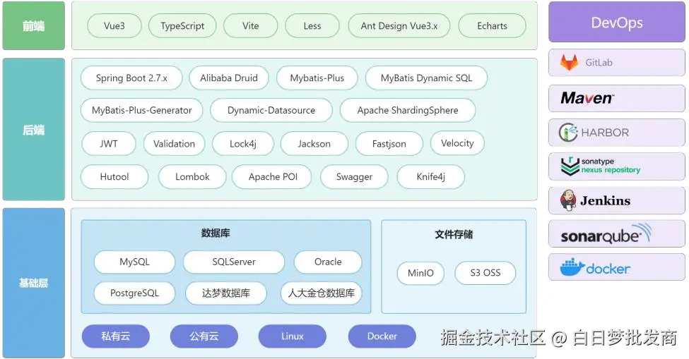 JNPF可视化拖拽+代码生成器+多端编译技术,与开发平台、集成第三方、Devops平台无缝整合,形成赋能开发、集成、测试、部署、运行、运维的完整开发构建服务。