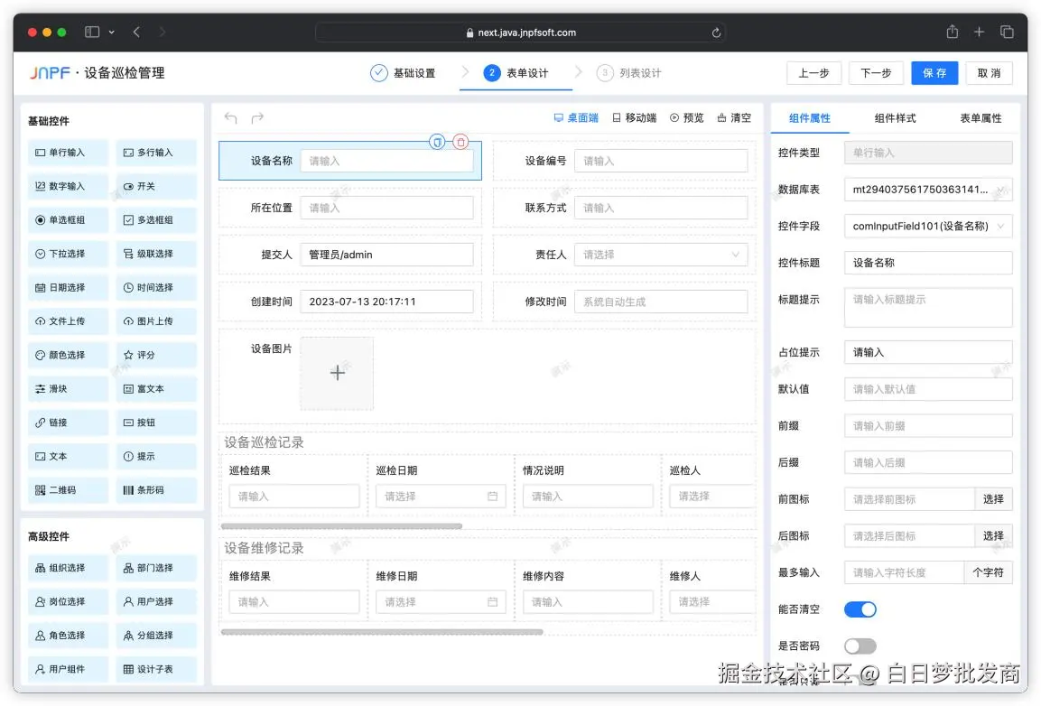 同时,JNPF支持模型关联更新。低代码本质上是通过各种模型能力来为开发使用者降低难度和提升效率。完整的低代码开发平台应该同时服务专业开发者和业务主管,必须支持数据模型自动生成或变更页面模型此类正向建模,同时也支持页面模型、流程模型这类更偏向业务的模型反向生成或变更数据模型的反向建模。