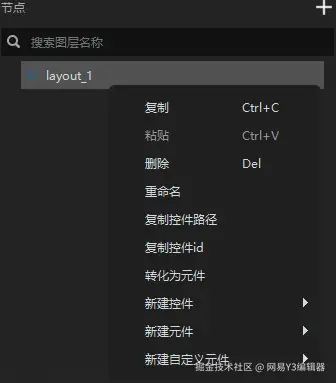 - 功能菜单:右键点击控件名称可以展开控件的功能菜单,你可以复制、粘贴、删除控件,也可以对控件进行重命名、复制路径,或者将控件转化为元件