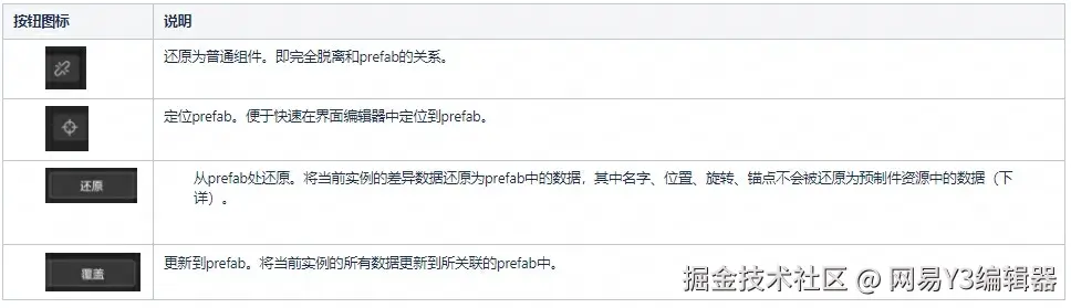 元件也支持复制粘贴,元件实例在画板中显示为蓝色。此外,prefab实例的根节点处置顶显示4个按钮:还原、覆盖、定位和解绑,可根据需要修改实例以及同步到元件中。