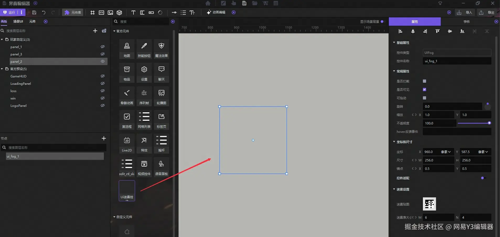 主要用于UI层面的阴影效果,常用来制作天赋树解锁等,如图 (需要美术制作贴图,没有特别需求不推荐使用迷雾控件)。