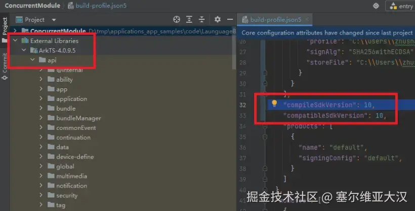 如果需要在DevEco Studio中使用编译的SDK,需要参考替换SDK相关文档完成替换。在应用工程级build-profile.json5文件中,设置SDK版本,如下图所示,然后点击该文件右上角的Sync Now进行同步,即可看到左侧的External Libraries的ArkTS版本发生了变化。