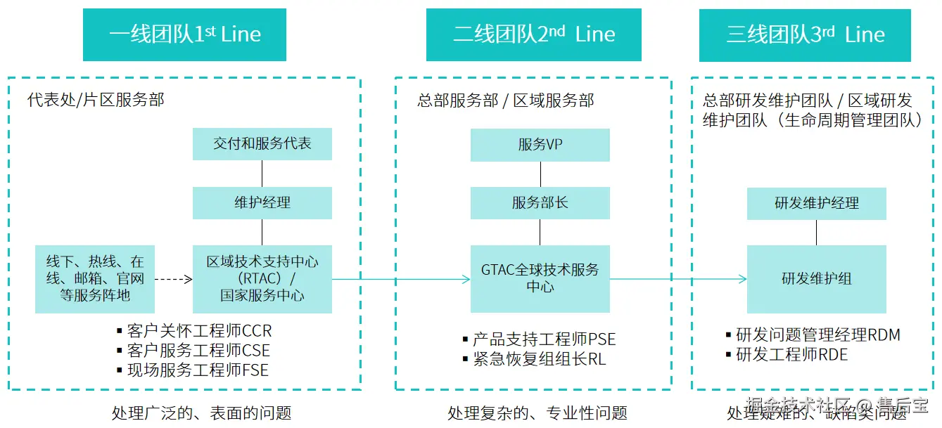 ▶二线,高级服务工程师,也就是服务中台。需要具有更强的专业性,处理问题的能力更加深入,能够思考如何更好地做服务,对一线赋能,并且从二线中产生干部。在产品研发阶段,对于产品的可服务性,高级服务工程师要能够提出要求,例如服务需求管理等。在产品发布之后,高级服务工程师要能够进行客户问题管理、服务规范制定、服务质量督查。