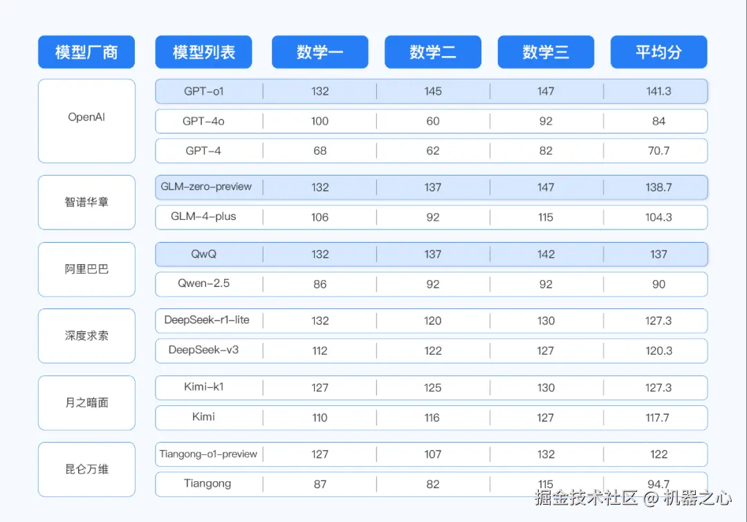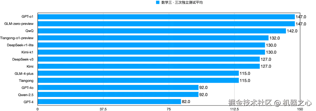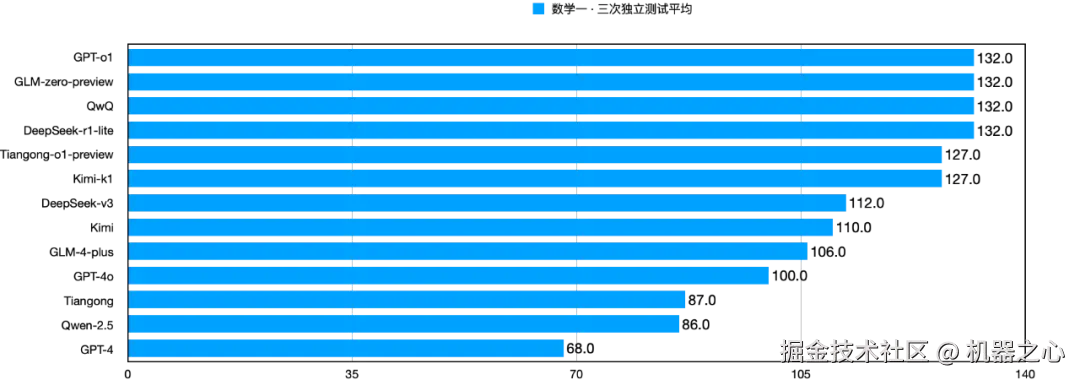 DeepSeek-r1-lite、Kimi-k1、Tiangong-o1-preview、DeepSeek-v3 则处于第三梯队(120 分以上)。