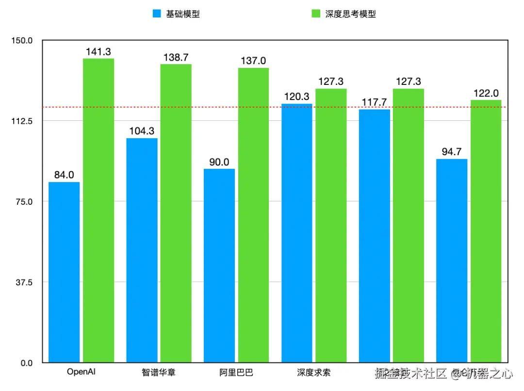 可以看出,深度思考模型普遍能够达到 120 + 的水平。这也彰显了深度思考模型在解决数学问题方面的强大能力。