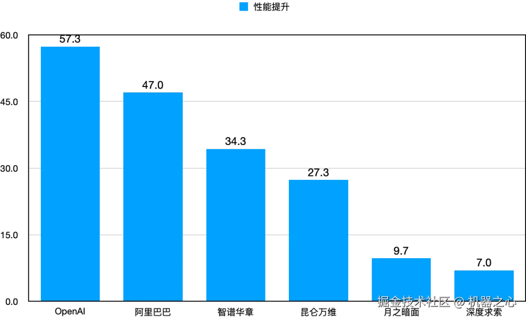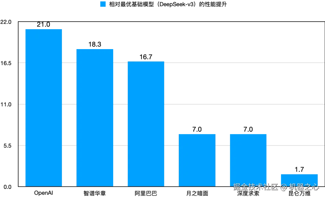另外,深度求索和月之暗面的提升幅度相对较小,这主要是由于其基础模型本身分数较高。以深度求索为例,其基础模型 DeepSeek-v3 初始分数高达 120.3 分,在参评基础模型中位居榜首。
