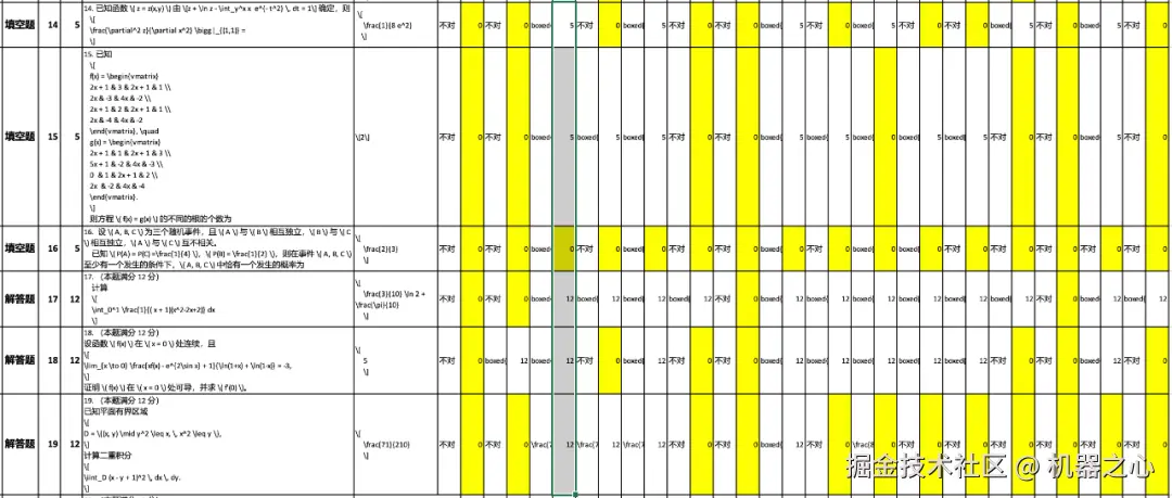 针对数学三的评测结果显示,模型出错的重灾区主要集中在第 14 题、第 15 题、第 16 题、第 19 题。相关错题分布情况如下图所示: