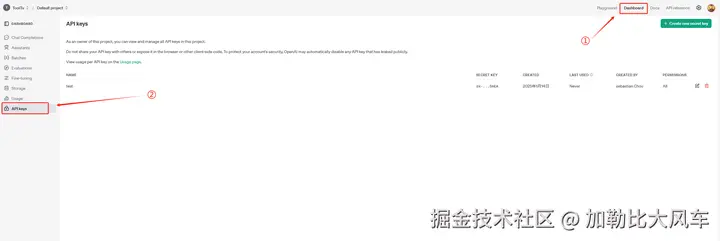 - 进入API页面: 登录账号后,点击左上角的“Dashboard”,然后左侧导航栏选择“API Keys”。