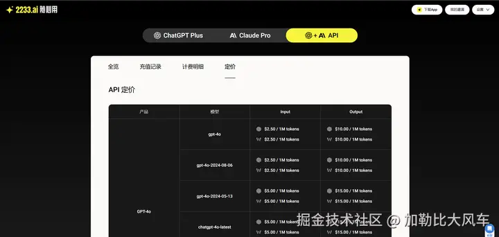 2233.ai随心用:只提供ChatGPT和Claude的相关API,ChatGPT的API价格上基本对齐官网,Claude的会略贵一丢。此外也提供ChatGPT和Claude的镜像。