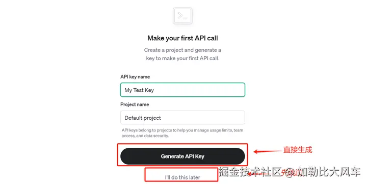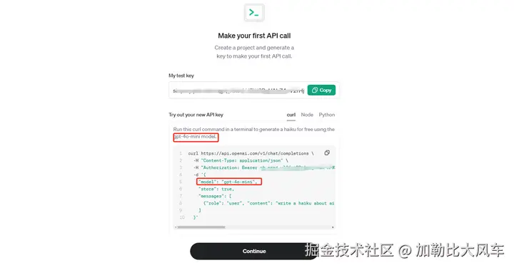 - 选择生成的话可以直接拿到一个API Key(记得保存好,这个只展示一次),已经是能直接用的,但只能使用gpt-4o-mini模型。