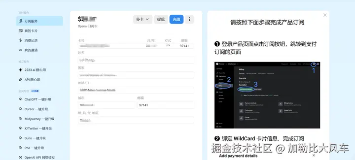 - 绑定海外支付卡:使用准备好的海外支付卡,按照指引填写就行。如果跟我一样用的是wildcard,在“订阅服务”那一栏选择“OpenAI API”,会提供一比一的填卡信息,照着复制粘贴就行。