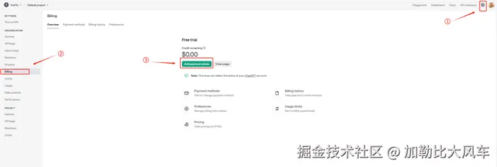 - 进入支付设置:点击右上角头像隔壁的 “设置图标”,左侧导航栏选择"Billing" ,点击页面上的“Add payment details”。另外,在设置页面同样能生成API Key。