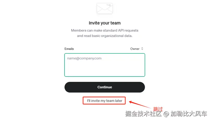 首次注册的话需要我们创建一个团队,以便后续生成自己的API Keys。