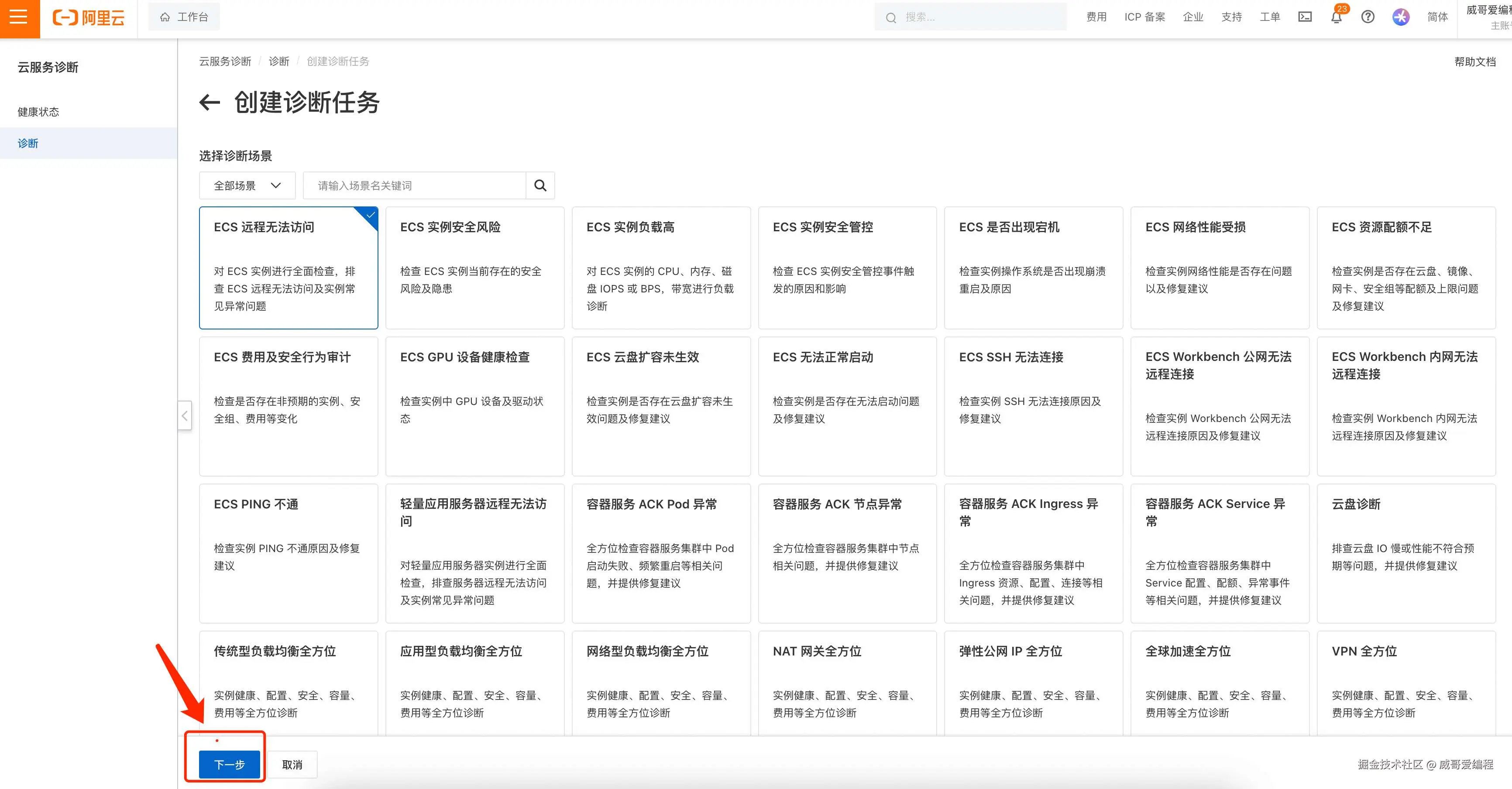 例如,我们创建一个诊断任务:ECS 远程无法访问,点击下一步。