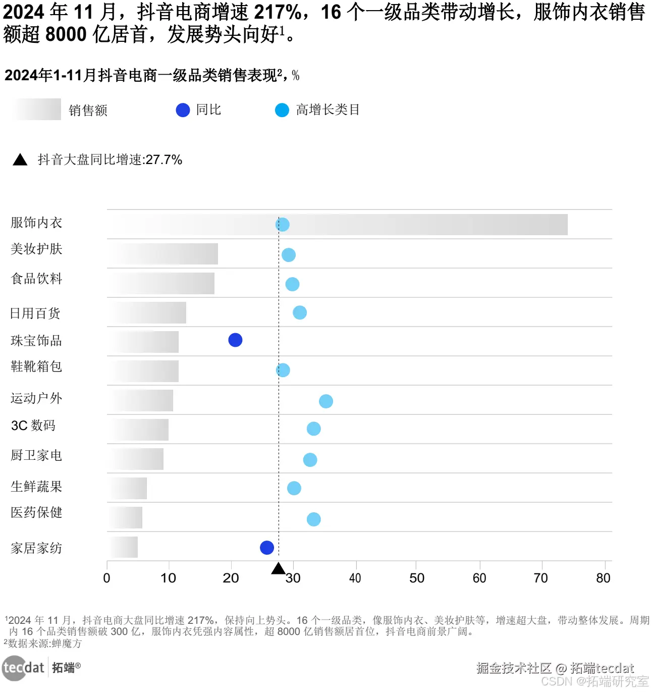 抖音电商 2024 年 11 月大盘增速 217%,16 个一级品类成增长主力,服饰内衣凭优势居首,整体仍呈向上态势。