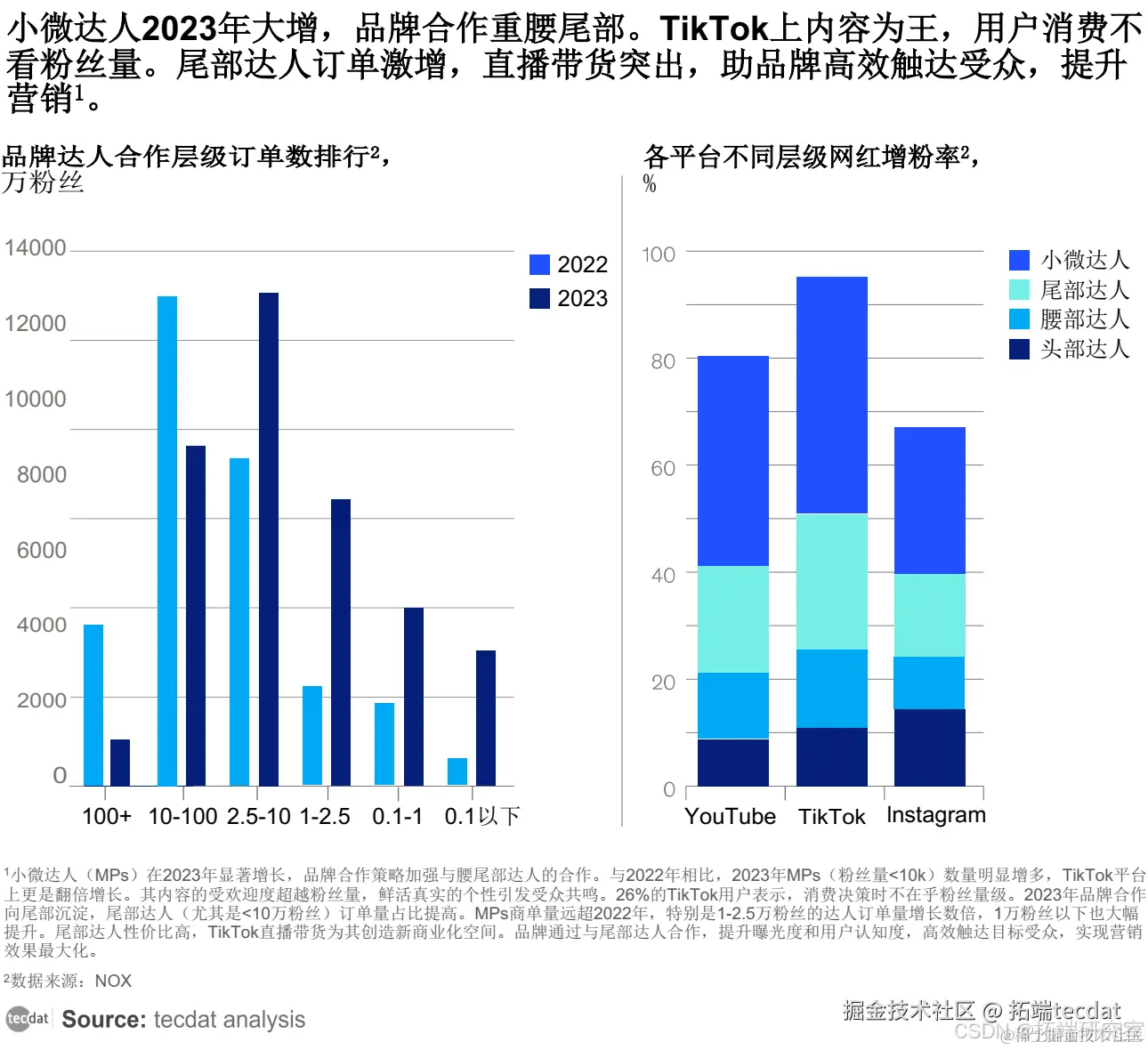 2023年TikTok小微达人迎来显著增长,品牌合作更注重腰尾部达人。相较于2022年,其数量增长明显,尤其是在TikTok平台增速高达两倍多,这反映出粉丝对小微达人内容的喜爱超越了粉丝量的限制,他们凭借个性和魅力引发受众共鸣,建立信任,在直播带货等方面助力品牌高效营销 。
