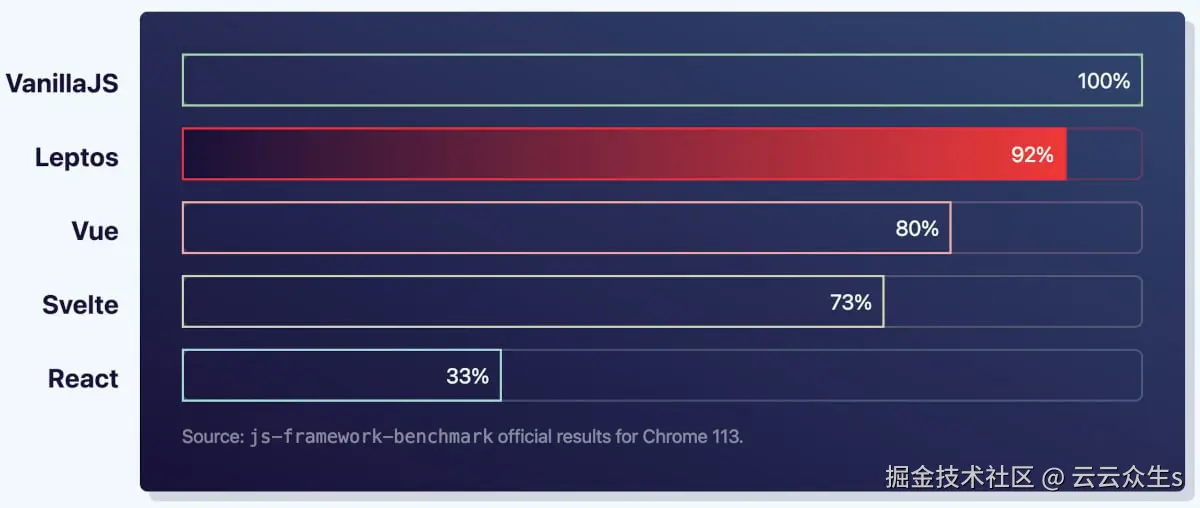 Leptos 将自己描述为“现代 Web 的前沿 Rust 框架”。该项目声称其 Web 性能仅次于原生 JavaScript——它表示其性能优于 Vue、Svelte 和 React(根据引用的基准测试,性能是 React 的三倍;见下文)。